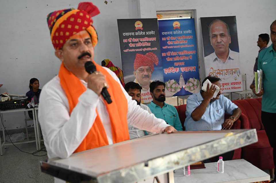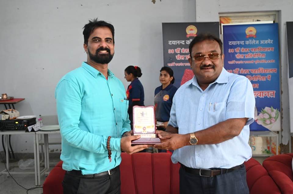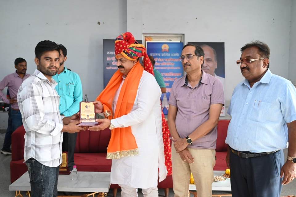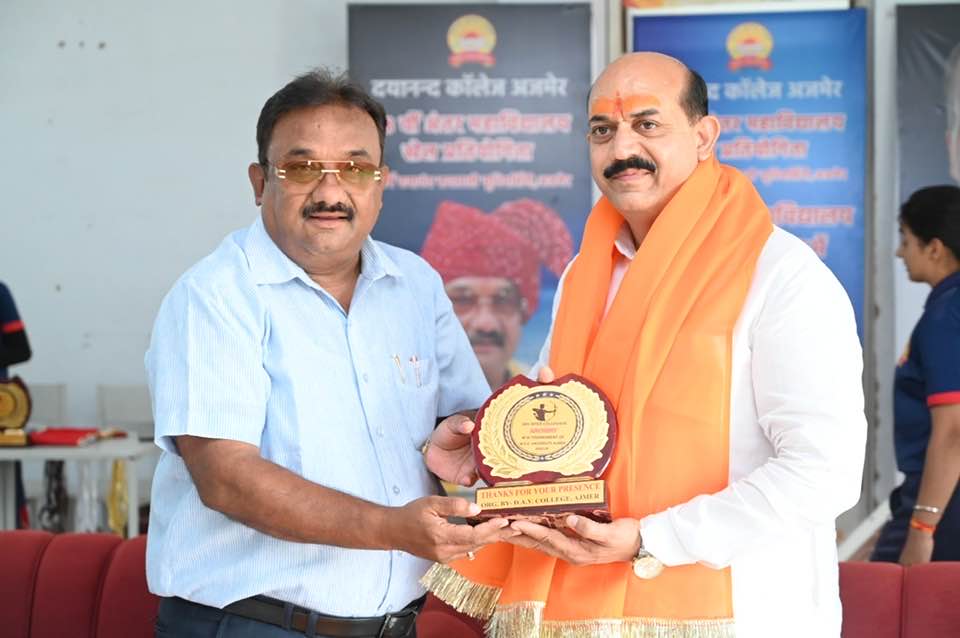 The closing ceremony of the 38th Inter-College Archery Competition of Maharshi Dayanand Saraswati University was held at the Mahatma Anand Swami Sports Ground of Dayanand College, Ajmer. The chief guest, Honorable Ramesh Ji Soni, President of the Bharatiya Janata Party, Ajmer District, distributed prizes to the winning athletes with his gracious hands. Distinguished guest Honorable Sunil Ji Jain also participated in the event.
